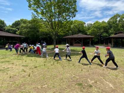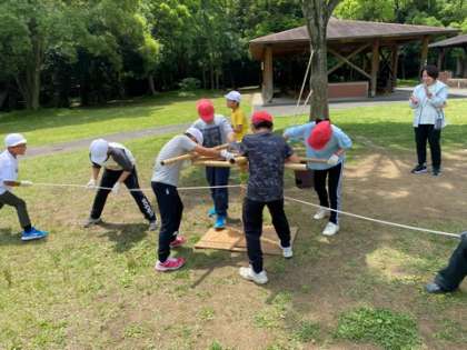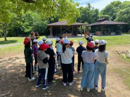 無事に施設に着きました。その後、クラスごとに協力して火起こしをしました。無事にどちらのクラスも火を起こせました。起こした火を使ってこれから班ごとにカレー作りです。