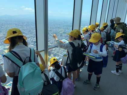 6月16日に社会見学であべのハルカスに行きました。JR環状線に乗り天王寺まで向かい、60階という高層ビルにみんな興奮気味でした。天気も非常によく、遠くまでよく見ることが出来ました。普段見る大阪城や梅田がジオラマのように小さく見えて子どもたちも楽しめていました。15時前には無事帰ってくることができました。暑い中みんな歩ききりました!