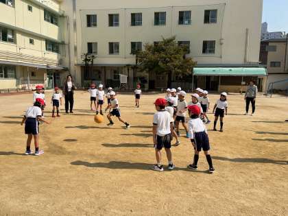 体育の時間に、運動場でボール遊びをしました。最初は丸い円を使っていましたが、慣れてきたので、四角いコートでのドッチボールができるようになりました。「ボールが怖い。」と言っていた子どもたちが、「もっとボールに触りたかった。」「あんまり投げられなかった。」と話すようになってきました。「もう、怖くないですか?」と聞くと、「怖くないよ。」と元気な声が返ってきました。「もうちょっと怖いです。」と教えてくれる子もいますので、譲り合いやルールをしっかり学びながら、みんなが楽しく活動できるよう、指導をしていきたいです。