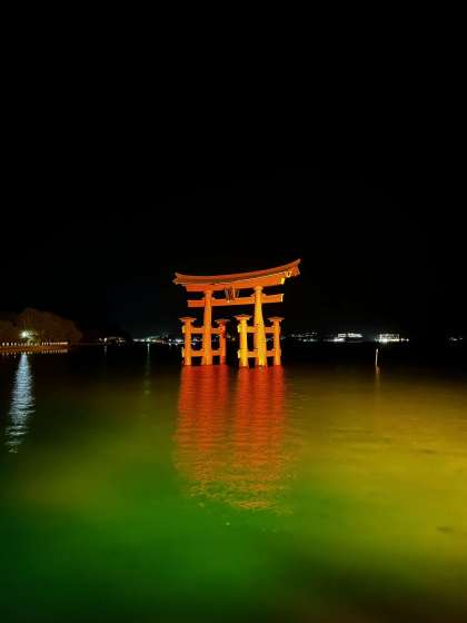 一日目の夕食後、夜の商店街や厳島神社を見に行きました。
