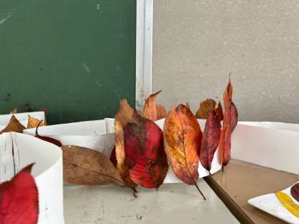 学校に帰ってきて、拾った落ち葉を使って冠を作りました。子どもたちは持って帰るのをとても楽しみにしています。