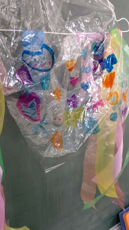 図画工作科で「ひらひらゆれて」の学習をしました。お家から持ってきたハンガーにビニル袋や紙テープ、スズランテープをつけ、マジックペンで色を塗ったり絵をかいたりしました。しばらく教室で飾っていると、窓から入ってきた風にテープがひらひら踊っていました。子どもたちは、「題名のとおり、ひらひらしてる!」と大喜びでした。