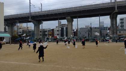 生活科の時間にビニル袋と竹ひごで凧作りをしました。はさみでビニルを切るのは難しかったのですが、身近な材料で自分だけの凧を作ることができます。油性ペンで思い思いの絵をかきました。