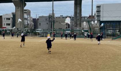 凧揚げでは、最初は自分の背の高さと同じくらいしか揚がらなかった子も、何回もチャレンジするうちにびっくりするくらい高く揚げることができるようになりました。