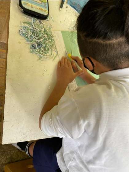 図画工作科では、多色版画に挑戦中です。彫刻刀で丁寧に画板を彫ることができています。さすが5年生です。多色版画のため、複数の色を使用します。どの順番に色を付けるかで、作品の色合いも変わり、彫刻刀で削る範囲も変わってくるので、よく考えながら取り組んでいます。出来上がった時が非常に楽しみです。