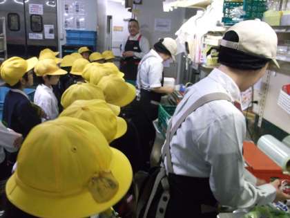 バックヤードでは、店長さん自ら先導して、調理場や保管庫の案内をしてくださいました。肉や魚のエリアでは、カットされる前の状態を丸ごと見せて頂き、子ども達は「でかっ!!」と驚きの声を上げていました。