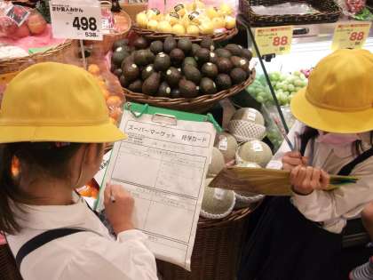 フロア内は班行動で、”スーパーの工夫”を探しました。子ども達は社会で学習した知識を生かして、「今日だけ特売で安いやつや!」「2個買ったらお得なんやで!」「卵とチーズオムレツの素、一緒に置いてたら買いたくなるよな。」などと、たくさんの発見をしていました。