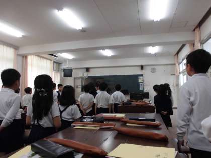 19日の学習参観、3年生は音楽室で音楽をしました。初めてのリコーダーを使った学習に、緊張しているようでした。