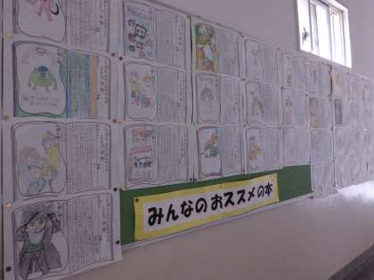 読書週間後、「本のしょうかい」を書いてもらい、全クラスから数名ずつ正門入ってすぐの掲示板に貼りだして紹介しています。