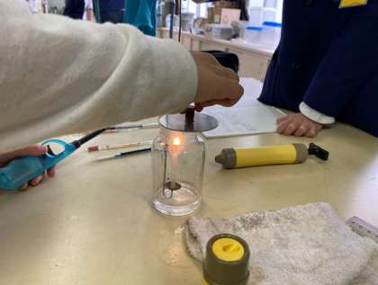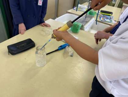 6年生の理科では、ものの燃え方について学習しています。ものが燃えることと空気とのかかわりを実験で調べています。高学年になると、実験用具も増え、扱い方も難しくなってきます。子どもたちは、指示をしっかりと聞き、集中して学習に取り組むことができました。