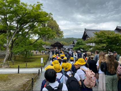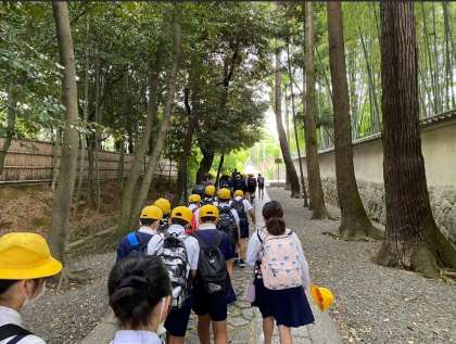 京都へ行き、大徳寺と鹿苑寺を見学してきました。大徳寺では、松の木が並ぶ道を歩き、自然に親しみをもって日本の文化に触れました。小鳥の鳴き声を聞き、木の葉が風に揺られる音を聞き、子どもたちは落ち着いた時間を過ごすことができました。鹿苑寺では、観光客が多かったため、ゆっくりと見学することはできませんでしたが、金色に輝くお寺を見て子どもたちは大興奮でした。メモに気づいたことをたくさん書き、短時間の中で集中して見学できました。