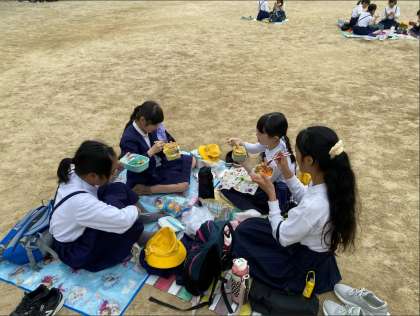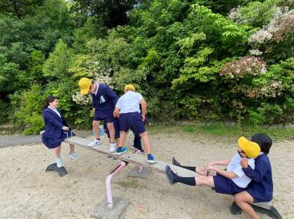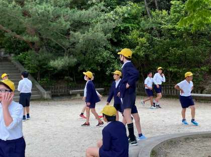 大徳寺・鹿苑寺を見学した後、近くの公園でお弁当を食べ、遊びました。昼食時は、曇っていた空も晴れ、程よい風が吹き、子どもたちはとても心地よさそうでした。公園には、見たことのない遊具もあり、興味をもって楽しく体を動かせていたようです。小さな子どもが遊びに来た時には、遊んでいる遊具を譲り、6年生として立派な姿が見られました。