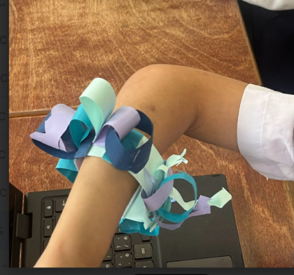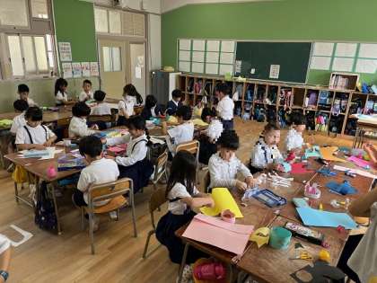 図画工作科では画用紙をわっかにして身につけるものを作りました。ブレスレットや冠、帽子やベルト、ショルダーバッグなど、思い思いの作品作りを楽しみました。授業の最後には自分の作品を身につけ、タブレットで撮影をしました。