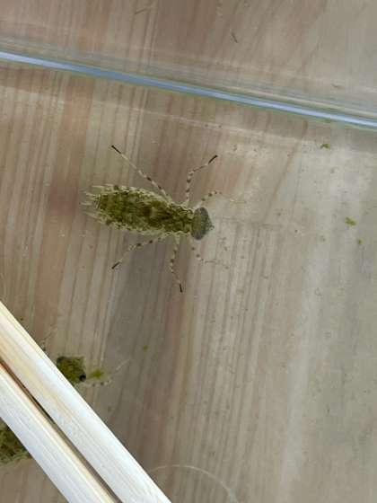 底の藻がたまっているところにヤゴがいました。今は2年生の靴箱の上の水槽で飼っています。調べてみると、たぶんアキアカネ(赤とんぼ)のヤゴだと思われます。トンボになるのが楽しみです。