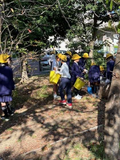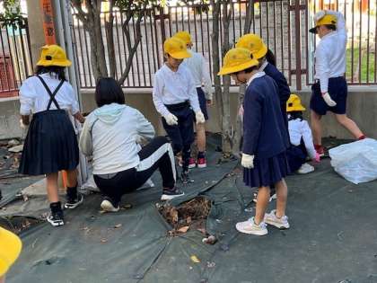 1、2年生は野中小学校周辺の落ち葉拾いや草抜きをしました。