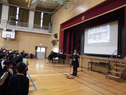 最後は全員、ハンドクラップで参加し、野中小学校の校歌を大合唱して大満足で音楽鑑賞会を終えました。