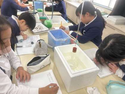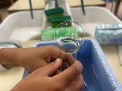 石けん水の膜で蓋をした試験官をにぎって温めると、石けん水の膜が膨らんだことをもとに、空気や水を温めると、体積はどうなるのかについて学習しました。