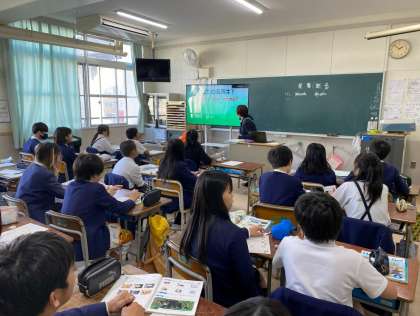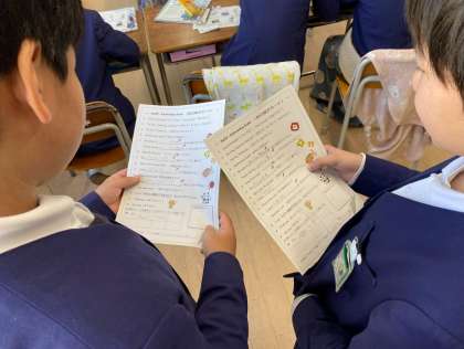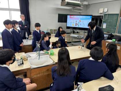 11月27日(水)5時間目は、十三中学校の先生が出前授業を行ってくださいました。1組は理科で、BTB溶液を使った授業でした。習った学習を踏まえて実験をしました。子どもたちは、色の変化から中和について学びました。2組は、外国語の授業で会話の学習をしました。ニックネームの呼び方や好きな色・できることなどの質問を通して、英語でのコミュニケーションを身に着けました。どちらのクラスも楽しく学べたようです。