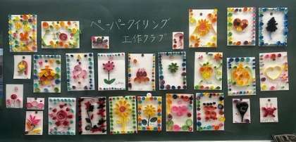 工作クラブの力作が完成しました。細長く切った画用紙を爪楊枝などでくるくる巻いてパーツを作ります。それを組み合わせて、1枚の素敵な絵を作りました。工作クラブでは珍しく3時間かけて大作に挑みました。中には、2つ目のミニ作品を作った子もいました。子ども達の力に感動です。