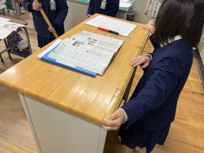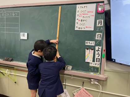 算数科では、1メートルの学習をしています。1メートルの竹物差しを使って、自分の身長の1メートルはどのあたりなのか確かめたり、教室の中のだいたい1メートルのものを探して測ったりしました。