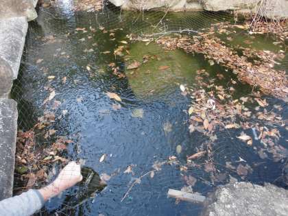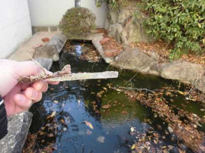 学校の運動場の隅にある池にも昨日に続き今朝も氷がはりました、少し割ってみると厚さがやく2センチくらいありました。寒いはずですね。池の金魚も底の方でじっとしているようです。