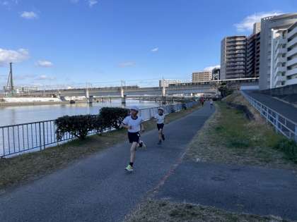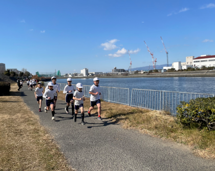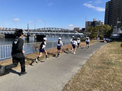 準備運動をかねて、神崎川の河川敷まで歩く間、楽しみな子も不安な子もみんなの気持ちはそれぞれに高まりました。