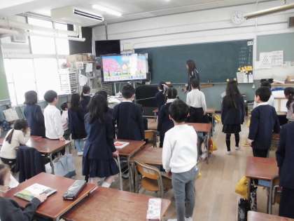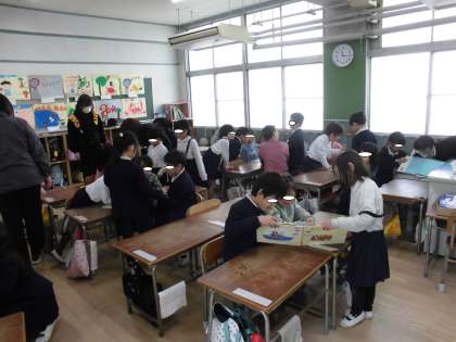 3時間目は教室で1・2組に分かれて一緒に絵本を読んだり、歌を歌ったりしました。