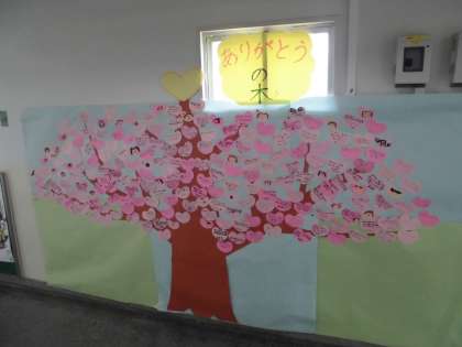 「ありがとうの木」には、たくさんのカードが集まり、言われてうれしかったことやしてもらってうれしかったことの花が咲きました。