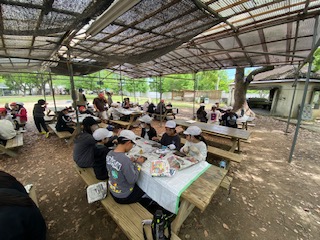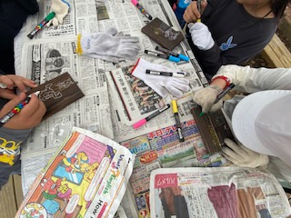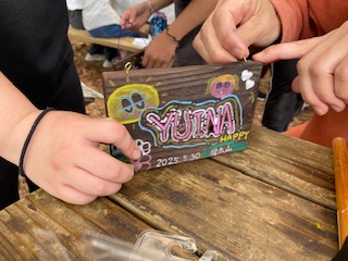 2日目の初めの活動は、焼き板クラフトです。昨日に焼いた木の板を使います。日付と信太山の文字をポスカで入れた後は、好きなキャラクターや信太山の景色を描いていました。作業に夢中になる程、楽しんでいました。