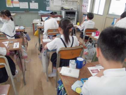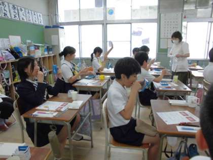 6月23日に、「歯と口の健康教室」で歯科衛生士さんから歯磨きの仕方を教えてもらいました。歯茎の状態を見て、葉の付け根が三角の状態になっているかチェックすると、歯磨きが足りていないと感じた子が多くいました。「これから歯磨きをもっとしよう」と思ったようです。