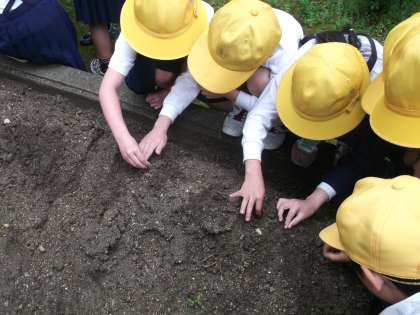 雨のやみ間をねらって学習園にホウセンカやヒマワリ、マリーゴールドの種を植えました。「なんで種の大きさに違いがあるんだろう」など、子どもたちからたくさんの気づきがありました。