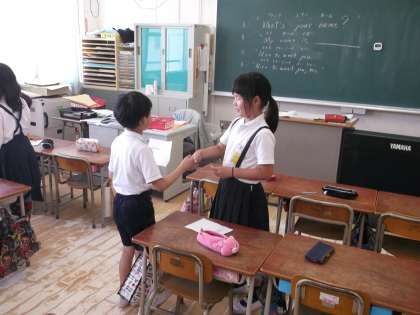 総合の時間に英語をしました。お互い自己紹介をしたり、ジェスチャーをつけて歌を歌ったりしました。たくさんのお友達に自己紹介ができた子やHelloの歌を覚えることができた子もいました。みんな声も大きくとっても元気でした。少しずつ英語を楽しんでもらいたいです。