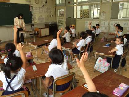 6月15日に「たべもののなまえをおぼえよう」をテーマにした栄養教室があり、栄養士の先生が他校から来て教えてくださいました。まず始めにプリントで絵と言葉をつなげていきました。「よく知ってるね」とお褒めの言葉をいただいて嬉しそうです。その後、黒板でも同じようにさせてもらいました。「やりたい人?」という問いかけにに一斉に手を挙げるやる気満々の1年生でした。
