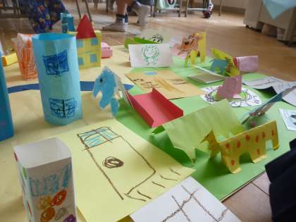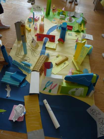 いつもは図工で一人一人の作品になりますが、今回は一人一人の作品を合わせて一つの大きな作品が出来上がり、大喜びの子どもたち。「小さくなってこの町に入りたいわ〜」と、みんなでのぞいている姿がほほえましかったです。