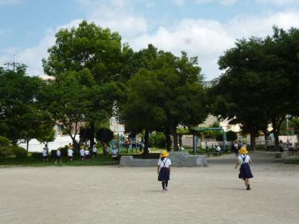 生活科で夏の公園探検に行ってきました。歩いて公園に向かっているときは暑かったですが、公園に着くと木々に囲まれ、気持ちの良い風が吹いていました。