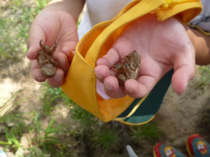 春みつけで公園に来たときとは違い、蝉の抜け殻をいっぱい見つけ、大興奮の子どもたち!耳をすまして蝉の姿を見ようと駆け回っている姿がかわいかったです。
