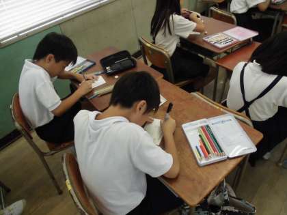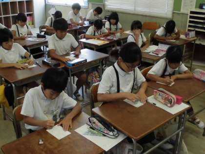 7月20日の終業式の日に、暑中見舞いを書きました。宛先は、自分たちの家です。夏休みを満喫中の自分や、家族に向けて文章を考え、夏のイラストを添えて完成させました。8月に入ったころにポストへ投函して送るので、届く日を楽しみにしていてくださいね。