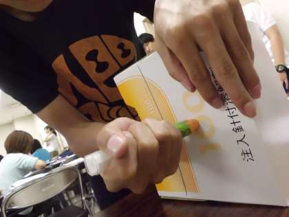 実技研修では、中が見えるように切ったダンボールに、本物のエピペンを一人一回ずつ打ちました。針や薬剤が出てくる様子を見て、そのときに手技者が感じる反発も体感することができました。また、実際に打つ際に児童が暴れることも想定されるため、その場合の適切な補助の仕方なども教えて頂きました。
