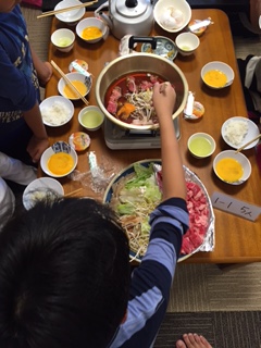 昨日と同じように1つの鍋を囲むと話が弾みます。さらに、甘いしょうゆ味に箸が進み、完食しました。