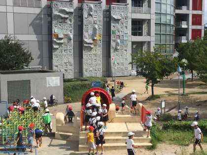 午後は、公園内の大きな遊具を使って自由に遊びました。大きな高速滑り台に何度も挑戦したり、芝生の上を自由に駆け回ったりして、楽しいひと時を過ごすことができました。