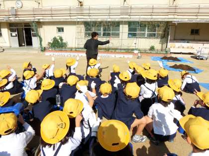 1年生は、人権の花運動の活動で、チューリップの球根を植えました。最初に辻川先生より、人と人は支え合うことが大切と、漢字の「人」の字を使って教えてくださいました。