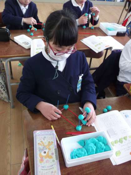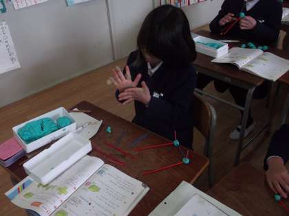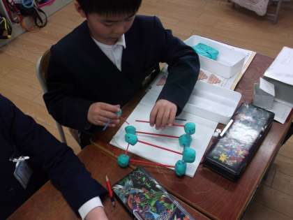 算数の「はこを作ろう」の学習では箱の形について学習しました。ねんど玉とひごを使い直方体の箱の形を作りました。子どもたちは、「難しいなー」や「できた!」などいろいろな声をあげながらもしっかりと集中して、箱の形を作ることができました。