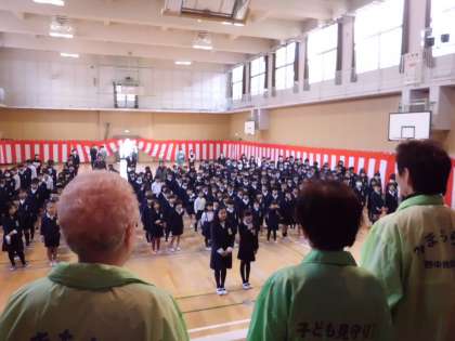それから、日々児童の安全のためにご尽力頂いている「みまもり隊」の皆さんをお招きして、児童代表の5年生からお礼の言葉が述べられました。