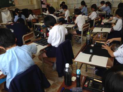 あっという間に、後片付けになりました。なぜか、指や筆の柄が真っ黒になったり、机の上に墨がこぼれたりしましたが、第1回目の毛筆習字は、無事に終わりました。