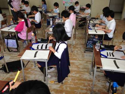 今日は、いよいよ墨を使って、毛筆習字の始まりです。教室中に、墨のいい匂いが広がりました。まず、硯に墨を入れ、筆に墨をつけました。先生の話をしっかり聞いているのですが、いざとなると、不安なんでしょう、なかなか硯に墨を出すことができない子もいました。先生に教えられるままに、筆をにぎり、筆を立てて「一」を書きました。頭では分かっているはずなのに、なかなか先生のお手本のようにいきません。でも、一人一人先生に見ていただきながら、何度も、練習しているうちに、筆の運び方と止め方のこつをつかんでいきました。みんなの顔は、真剣そのものです。