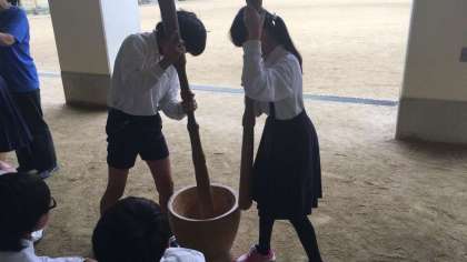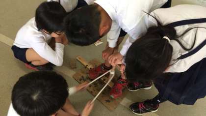 学習の中では、一生懸命教科書や社会科資料集を使って調べ、考えている子どもたち。この出前授業では、普段の学習では写真でしか見れない、触れない、使えない道具を実際に使い、様々な体験をさせていただきました。弥生時代の人たちがどうやって火をおこしていたのか…木の棒やひもを使って、必死に取り組みます。「しんどーい。」「つかへんなぁ…」「あっ!けむりが出てきたー!!」とうれしそうに、また友だちと協力して頑張りました!!また、もみすり体験もさせていただきました。臼の中にお米を入れて、大きな杵を使ってもみすりします。かなり重かったようです。もみ殻をとる時には、自然の風を利用することも知りました。