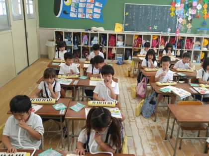 音楽の時間、小学校では初めてのけんばんハーモニカを弾きました。幼稚園や保育所などでも弾いたことがあるようで、上手に使っていました。