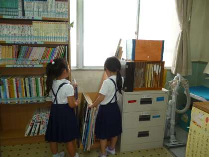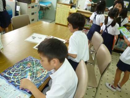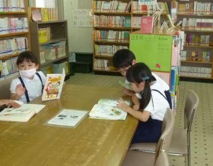 お昼休みのお楽しみは、図書館開放です。お昼休みに図書室に行ってみると、たくさんの1年生が本を読んでいました。