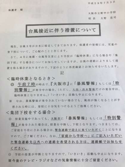 ・授業中であっても大阪市に「暴風警報」または「特別警報」