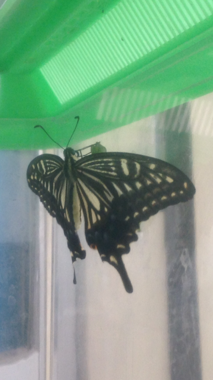 先日、今まで育てていた最後の蝶が無事に羽化し、元気に大空へ飛び立っていきました。学習園のキャベツや校舎裏のミカンの木で見つけたモンシロチョウとアゲハの卵や幼虫を育ててきました。今年は、モンシロチョウが7匹とアゲハが2匹羽化しました。理科の教科書やNHKの動画で学習を進めながら、実際に観察もしてきました。ちょうど、国語科で学習した「自然のかくし絵」ともリンクし、新しく始まった教科、理科にも意欲的に取り組むことができました。